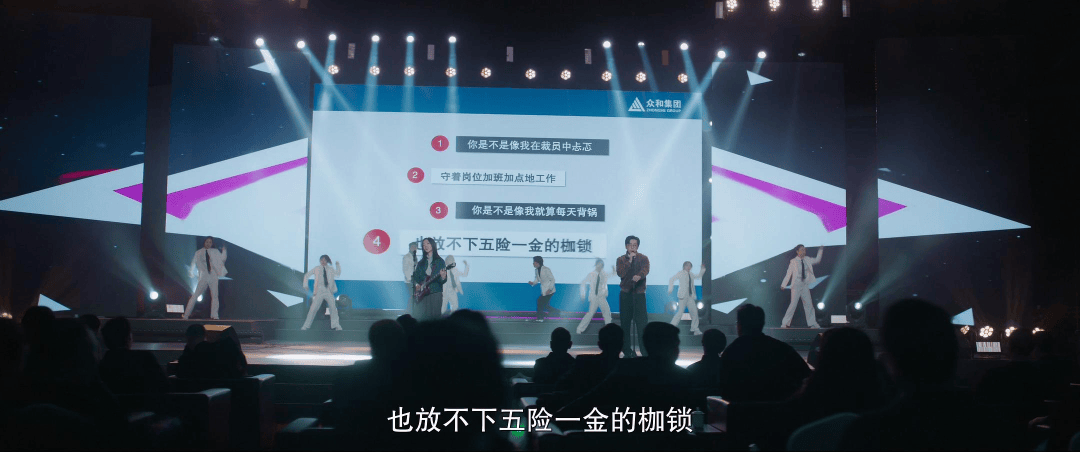 电影《年会不能停!》中同样出现了讽刺现实的一幕:集团既要裁员降本增效,又要花大钱办年会。(图/《年会不能停!》)