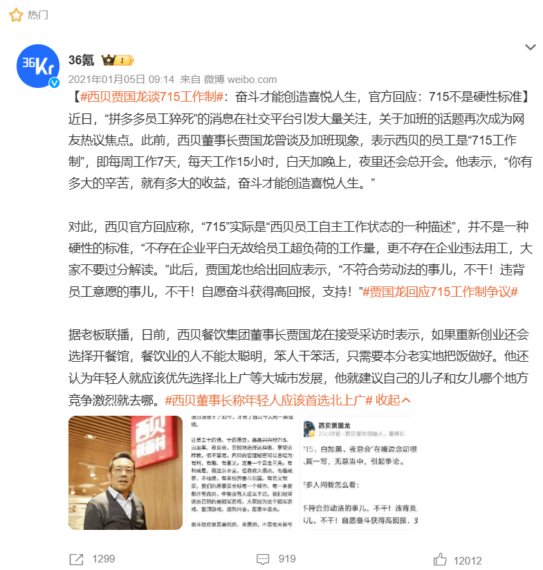 在那封几乎被全网吐槽的西贝官方道歉信发布后,一名网友的点评获得了一千多个赞:“能想象品牌公关团队熬夜开会憋出来这一篇给老板送审后,老板仍然沉浸在自己的世界里(坚持要讽刺顾客),(导致了)又一场灾难级公关。”贾国龙过去关于加班的言论也被翻出来,对企业口碑产生了“雪上加霜”的效果。