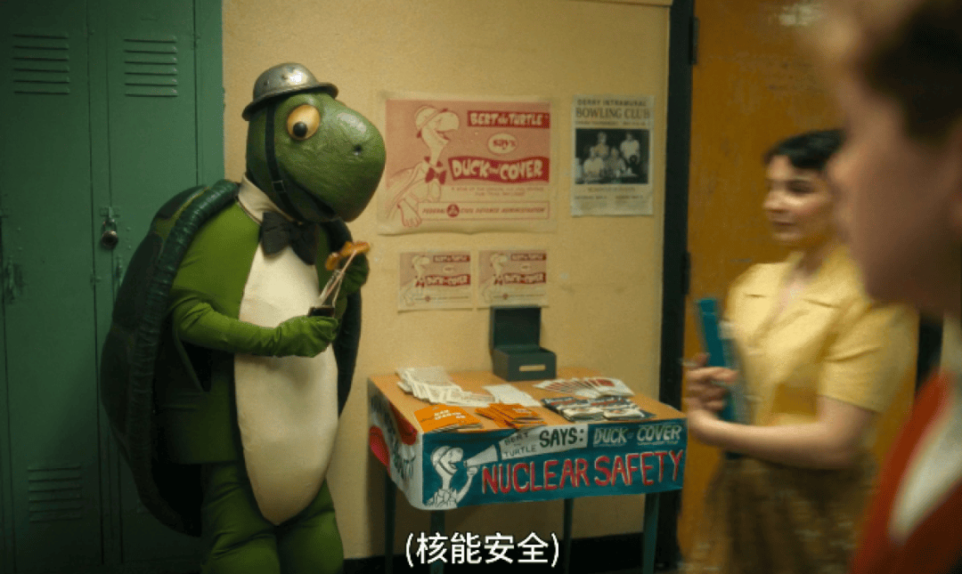 甚至有一个“伯特乌龟说:趴下和掩护”(Bert the Turtle says duck and cover)的安全宣传标语,这是1960年代核安全宣传的梗。