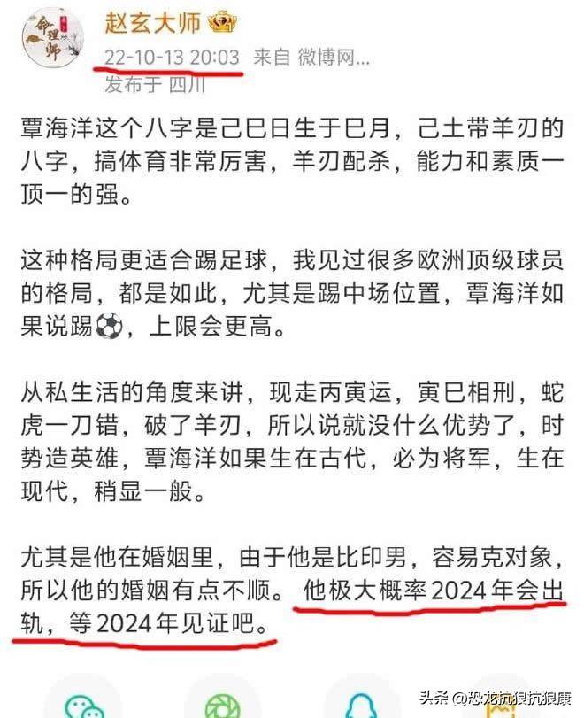 就在事件持续发酵之时,一位名叫赵玄大师的神秘博主,突然被网友们扒了出来,这位博主曾在两年前公开预言,称覃海洋“极大概率在2025年会不忠诚”,现在,预言似乎成真,这让不少网友感到细思极恐难道这场“塌房”事件真的早有预兆?