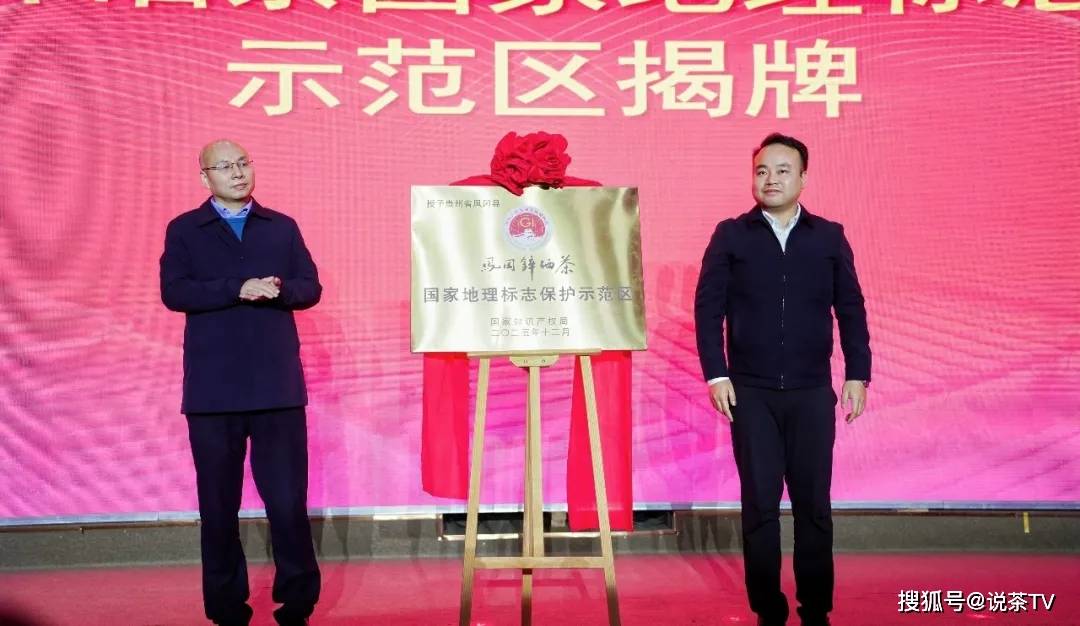 △农业农村厅项目中心副主任、贵州省茶叶专班常务副班长雷睿勇(左)与凤冈县副县长余航夫(右)为“凤冈锌硒茶国家地理标志保护示范区”揭牌(活动主办方供图)
