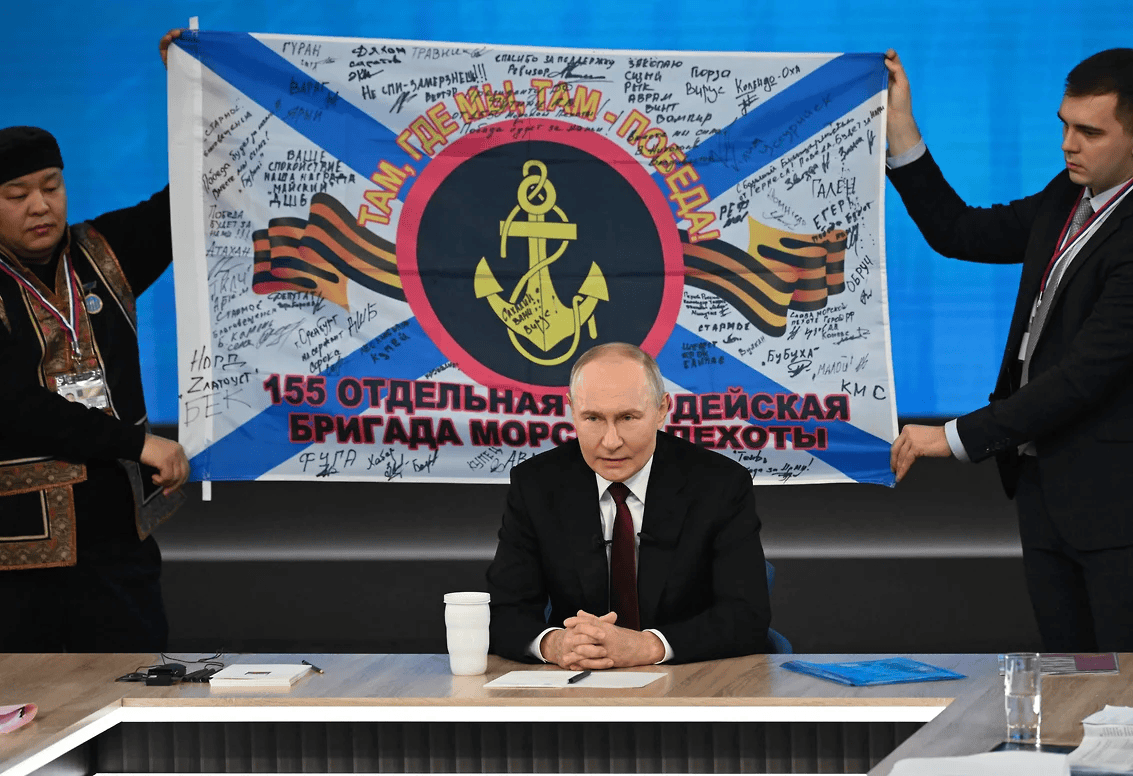 俄罗斯太平洋舰队海军陆战队第155旅的战士向普京转交战旗,普京在直播连线中展示了这面战旗。